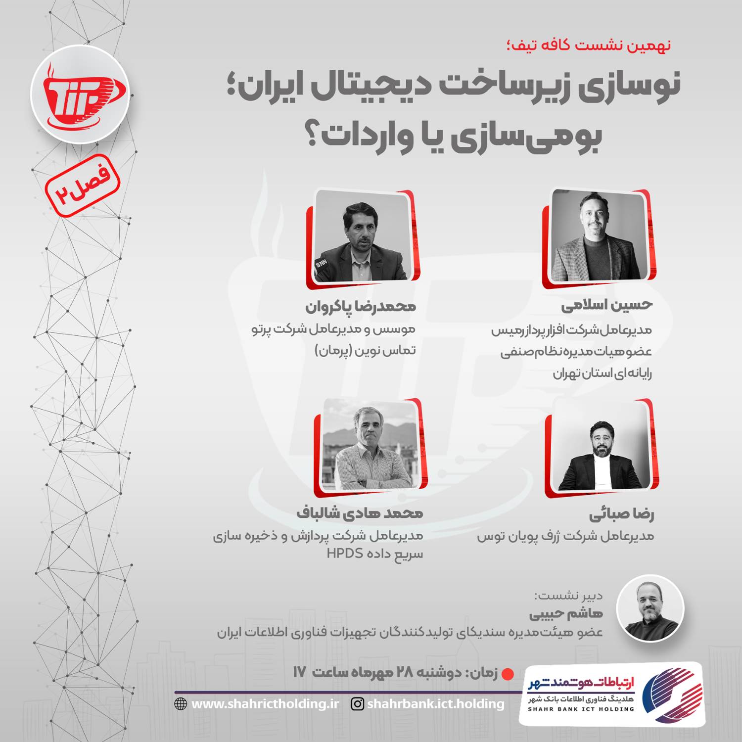 دبیری این نشست بر عهده هاشم حبیبی مشاور و عضو کمیته فناوری اطلاعات بانک مسکن و عضو هیئتمدیره سندیکای تولیدکنندگان تجهیزات فناوری اطلاعات ایران خواهد بود.